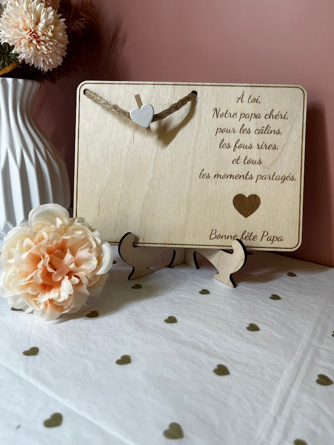Carte en bois personnalisée avec support : pince cœur pour photo
