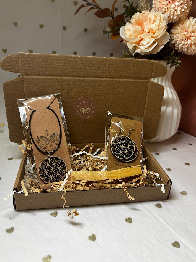 Coffret Fleur de Vie : Collier et Boucles d’oreilles en bois + Palo Santo (édition artisanale)