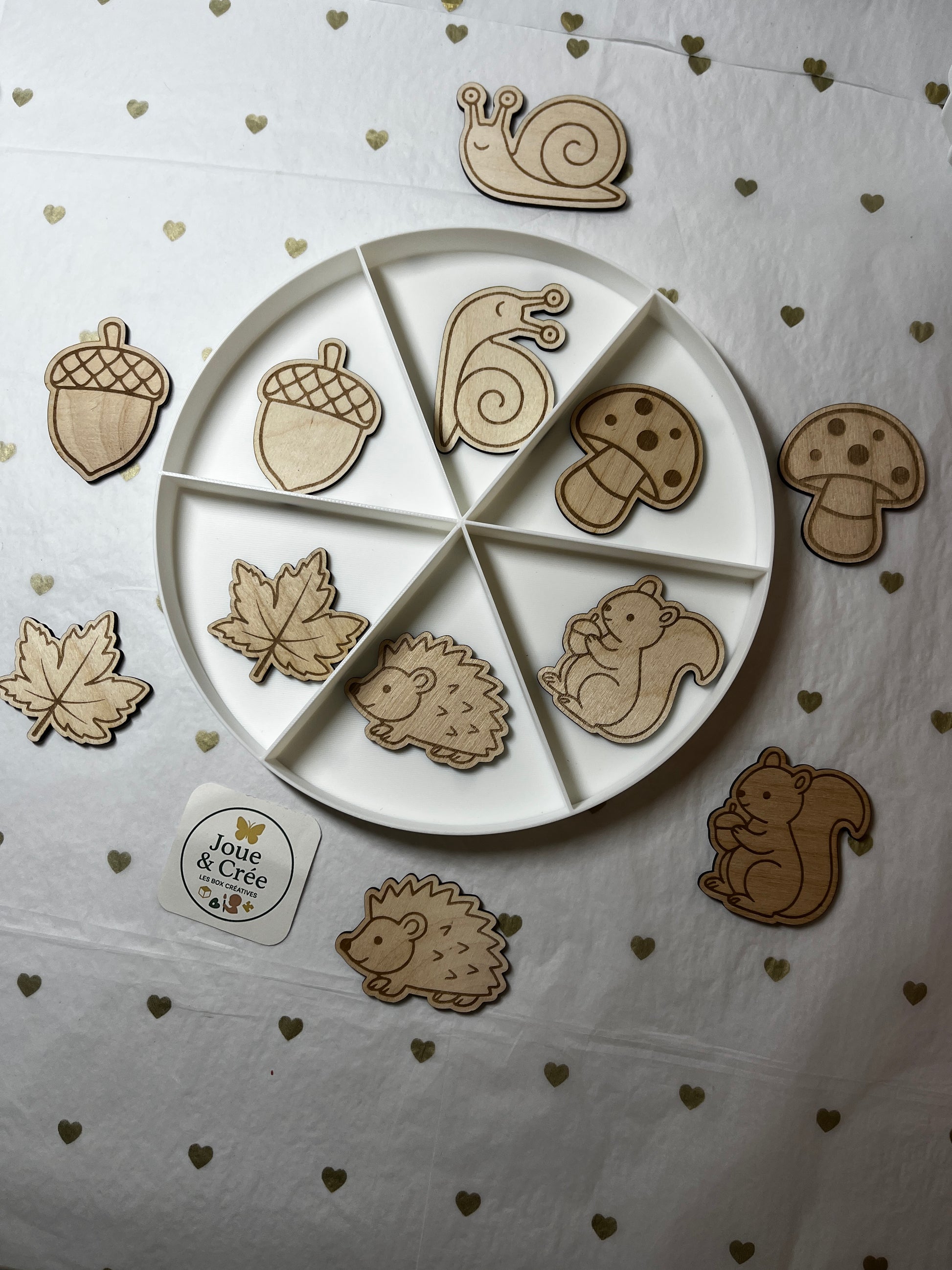 (2 exemplaires de chaque motif) Écureuil, Escargot, Hérisson, Feuille d’érable, Gland et Champignon