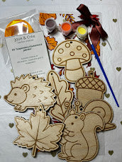 Le kit comprend : 1 feuille, 1 champignon, 1 hérisson, 1 gland, 1 escargot, 1 écureuil, 1 pinceau, 3 pots de peinture (marron, rouge et jaune nacré) et 1 ficelle satinée pour suspendre chaque décoration.