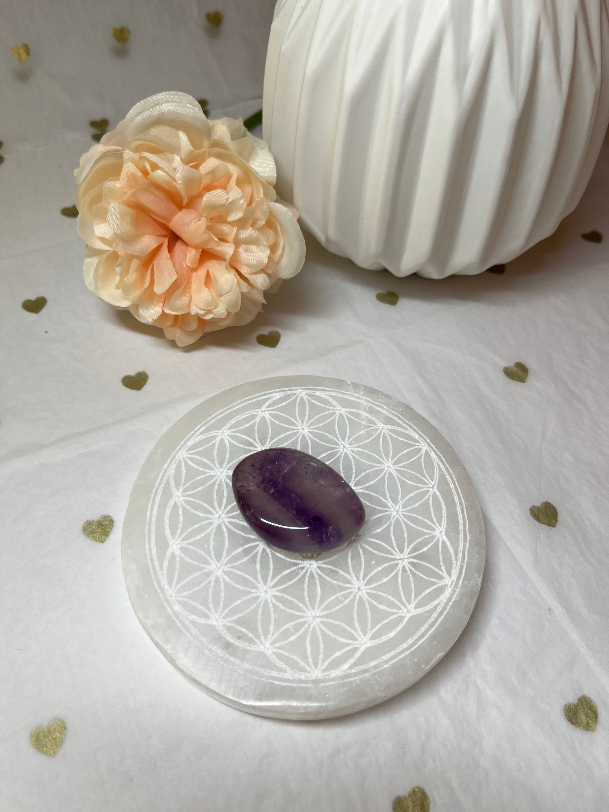 Purification : Fumigation avec les bâtons de Palo Santo ou bouquets de sauge blanche, bol tibétain chantant ou eau de source pure. La plaque de sélénite avec fleur de vie gravée purifie et recharge simultanément. Évitez le sel qui peut altérer l’éclat.